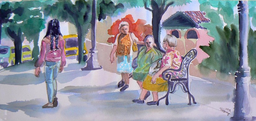 Walking in downtown Ajijic, along a small crowded street, a shock of white caught my eye. It was coming from a dark doorway. I couldn’t make out what it was exactly so I stepped closer to get a better look. There were art objects in the doorway as well; a big earthenware bare brown jug with a minimum of decoration, as well as tables with sculptures and displayed paintings.