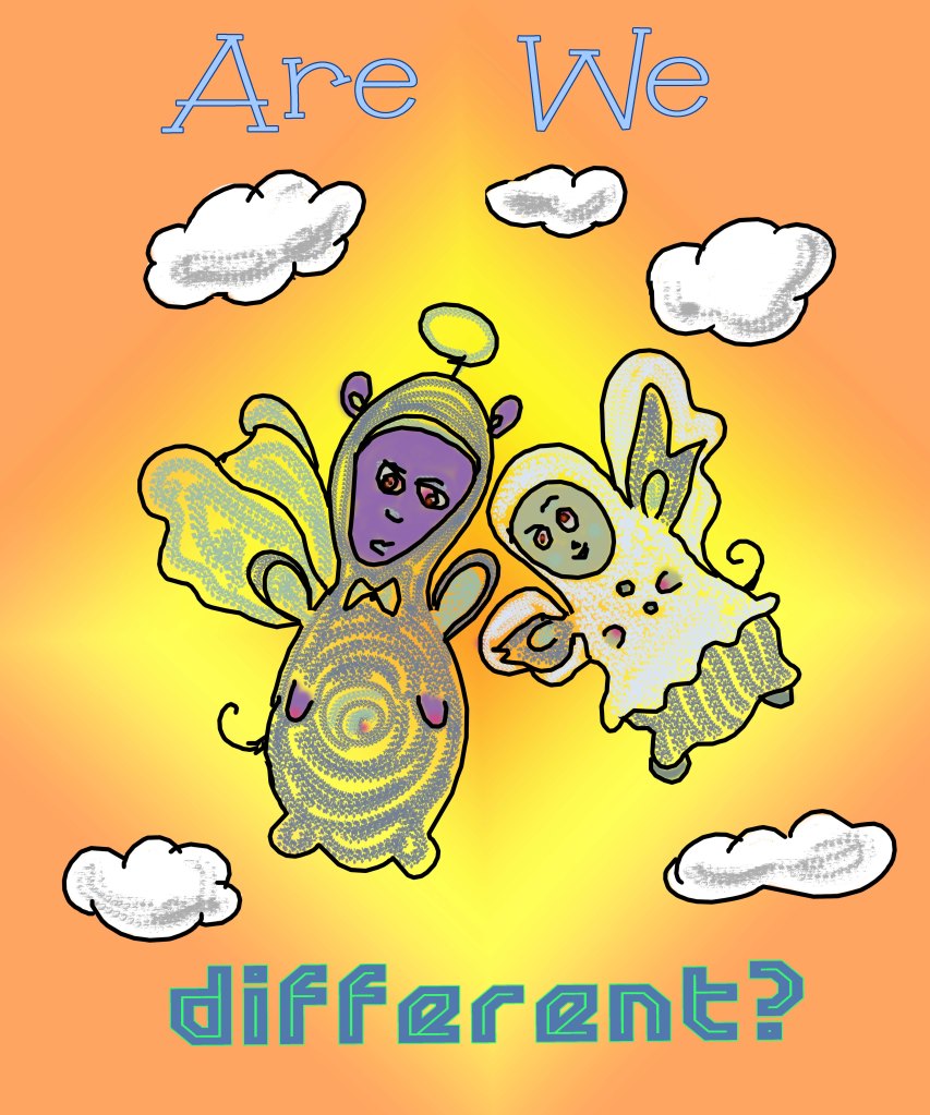 Two adorable critters are having a serious discussion on the subject of whether or not they are different. Seriously? They are like night and day. They are not people or goblins or menacing anythings. They are just critters wondering why they don’t fit in? So tell me who fits the norm if we can agree that they certainly are different.