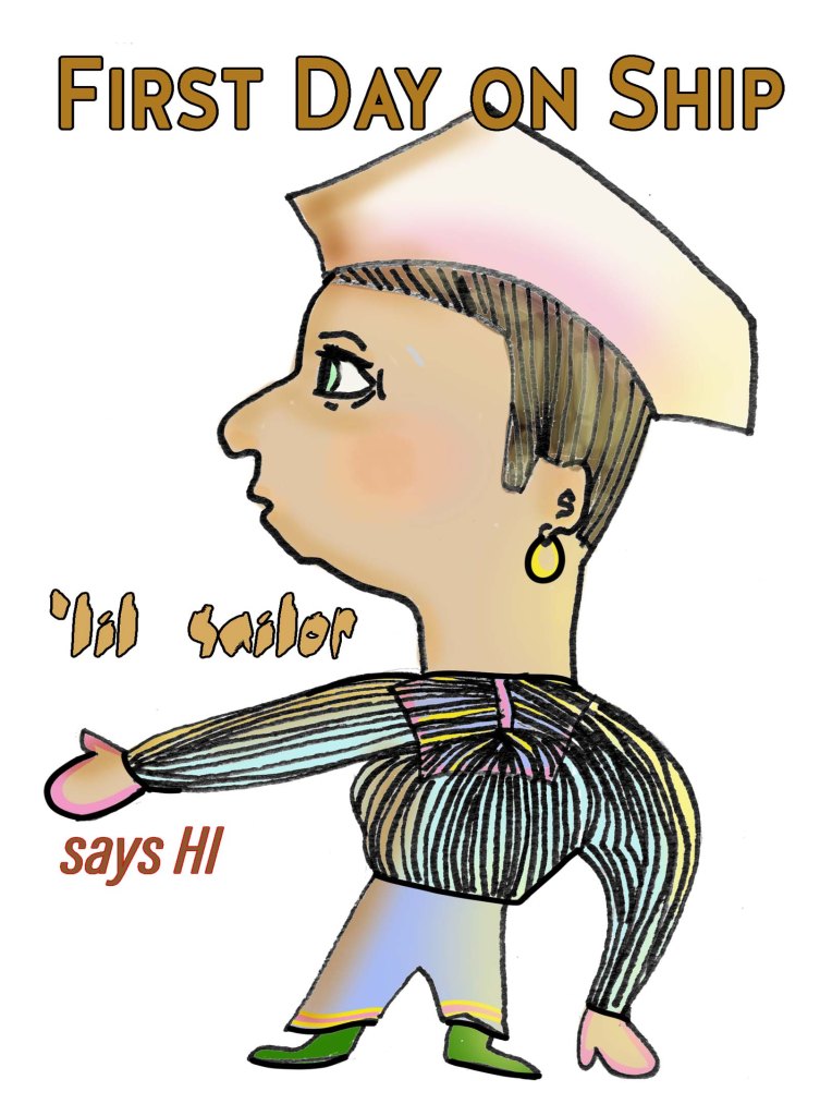 Here’s a little sketch that I like…even though it’s ink on paper, it has gone through lots of changes. I have been having success with masking lately and I love coloring my art and combining it with text. I hope what is coming through here is the feeling that we all have had from time to time in new situations. You meet new people, go to new places where there are new groups of people that you don’t know etc. How awkward it can feel to be out of the elements that you call home. This little guy is not ready for prime time players as we can see by the look of sheer terror on his face. OF COURSE, a lot if not most of my art is not commercial but I put it out there on products for people to have fun with. I call this on another not commercial art in commercial art forums. ha Just picture what kind of ship he just got onboard to.