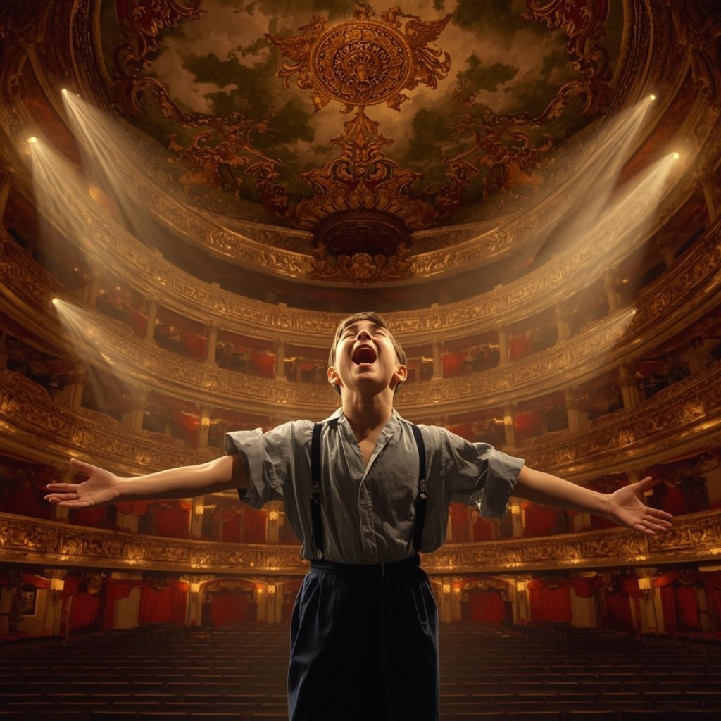 nowhere. I followed the voice to see the boy. He was singing arias songs in Italian. He sang his heart out and it echoed and carried in the hall. He sang one aria after another. He was kind of chubby and he had a big tuft of black hair. When he sang, it sent chills down my spine.