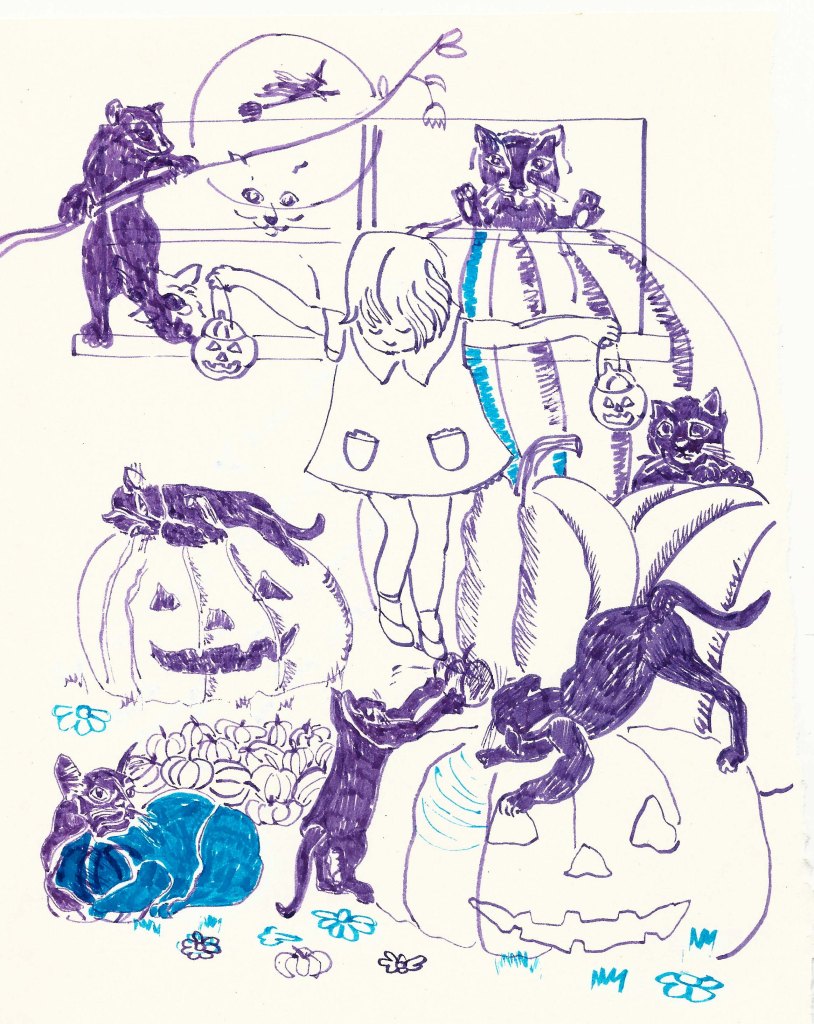 A little girl with miniature jack-o-lanterns. Of course my horse. She needs to light the way into the night. She is painted with watercolor and pencil and various digital textures. She can be found on a poster or a greeting card or a coffee mug. Really? Absolutely. I wanted to show a little bit of process here. Sometimes an idea goes through many changes. This is a typical example for me of how I like to modify and experiment. Here’s a link to my products with the final design.