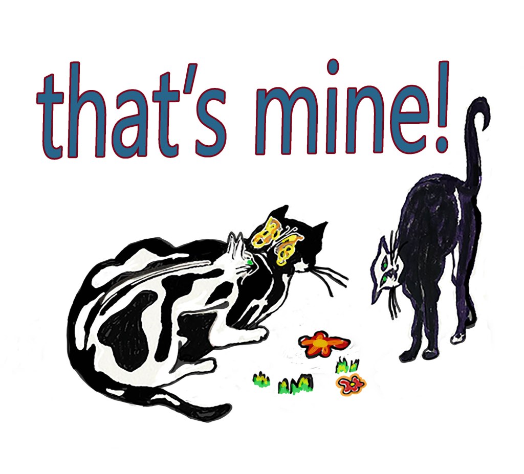 We’ve all seen this. It’s not really a fight but more of a stand-off. The big guy walks around with a shadow of his former self on his back. See his alter ego white cat with the green eyes and reverse calico markings on his back. Just in case you didn’t guess, he’s just a gentle soul because he also has a butterfly on his head. Fun. This one will definitely appear in my small picture book series. Number 1 on friendship is complete, number 2 in process…it’s about lunch. what? yup. Just fun stuff.