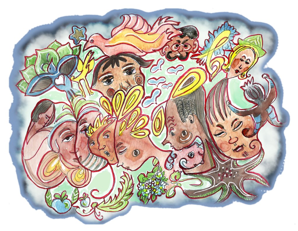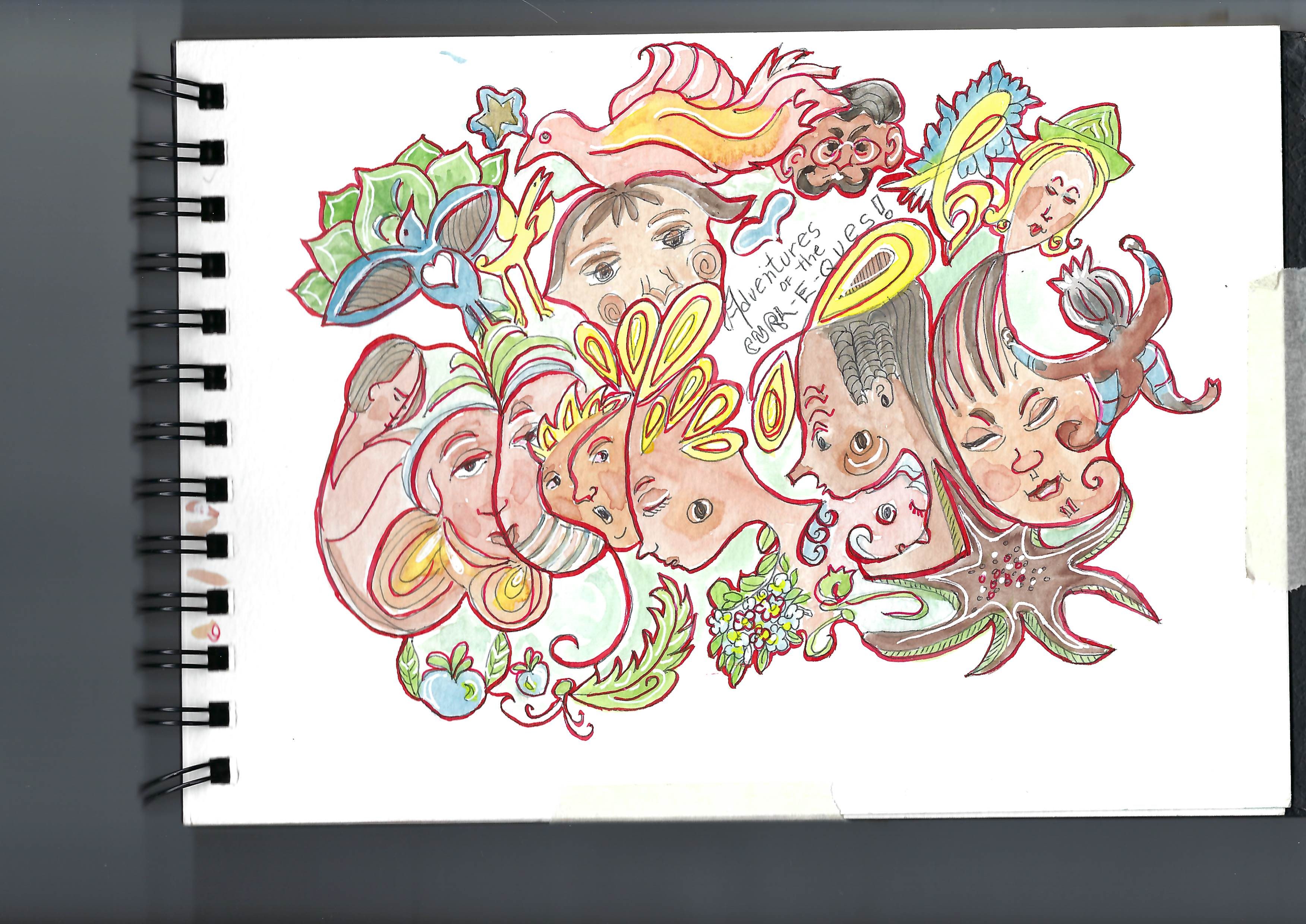 Sketching face doodles from imagination. At this point, everything I’m drawing is from my head only. Here I’ve transformed pen and ink on watercolor paper to a png with some modifications–text, cleaning up, background and color burns, etc. I saw this through a cloud of faces and hoped to represent it that way. I am calling this group the Curly-Q’s. I hope to incorporate them into one of my little picture books. I am sure I will find the right place for them. Here is another shot of how it started out. The whole image began with pencil swirls on watercolor, scanning and then went through a lot of changes in photoshop.