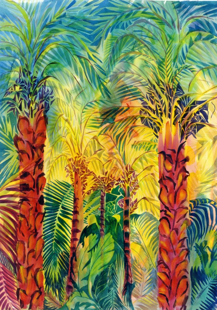 I love the palm trees for their majesty, their colors, their patterns. This watercolor has a lot of very intense color and the negative spaces are strong. This is one of my favorite color palettes.