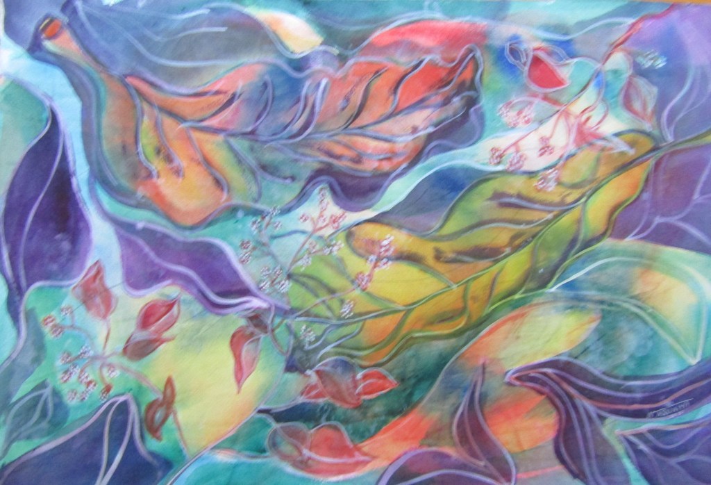 This is a large watercolor and right now it’s in the gallery waiting for a home. I’ve been painting big lately and it feels really good. There’s lots of underpainting and patience in preserving the white areas in this work. That’s really necessary to keep the colors clean and the feeling fresh. The basic idea to start with was to take leaves and branches from my little