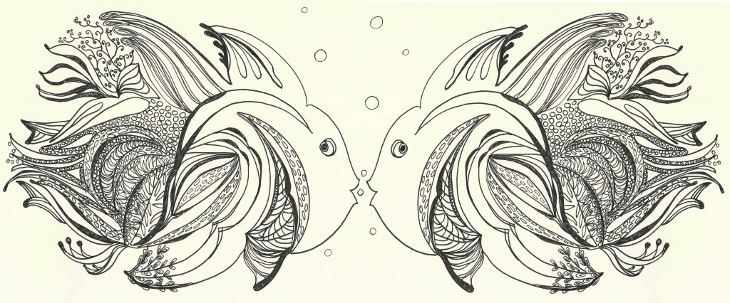 These two fantasy fish are pen and ink line art drawings done the old fashioned way .,..with a crowquill pen and Higgins black drawing ink. Of course, they are mirrored images of themselves in photoshop.
