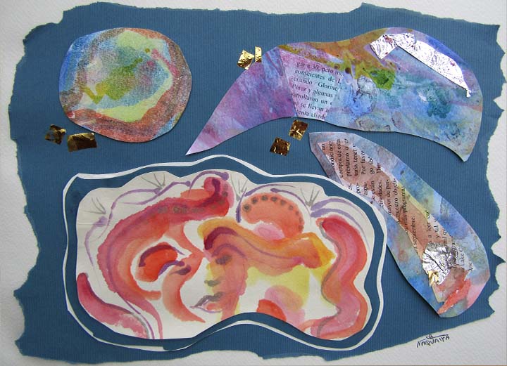 Life is lately about trying to keep your sanity in a crazy world that’s going crazier by the minute. For me, painting watercolors is about keeping my skills together while the world tries to tear us apart in a negative atmosphere. Am I nuts? Nah. I’m pretty normal considering the curveballs I’ve dodged. So I’m taking pieces apart and put them back together hoping to stay on track. Sometimes this is sort of a thereapy. OMG I use a camera, scanner, paints and brushes, glues and tape and anything I fancy to piece together. It’s about ideas, expressions, words. Old school stuff. Well, I guess I’m old and that’s all there is to it. I still have fun with my art and there’s nothing old about that. This piece measures 9″x12″ without frame.