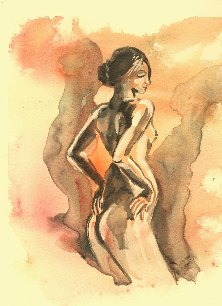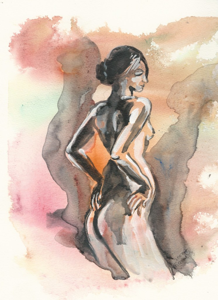 Here’s the first watercolor that I painted from a live model at Clark College in Washington at their evening life drawing sessions–back in 2007. The 1st is the original and the 2nd is one that I just played with some color filtering.