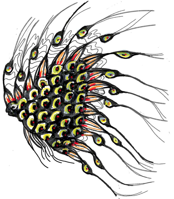 This is an exotic angelfish from my imagination. I never started out drawing a fish. These were just brush marks with black ink on white paper. Just a doodle for sure. Then when I looked at it later I thought it looked a bit like a fish and it might be fun to enhance on the Cintique. Well, the little guy kept growing and getting stranger and stranger as I went along. In the end though I think those long wavy things hopefully look like part of his flowing body in the water.