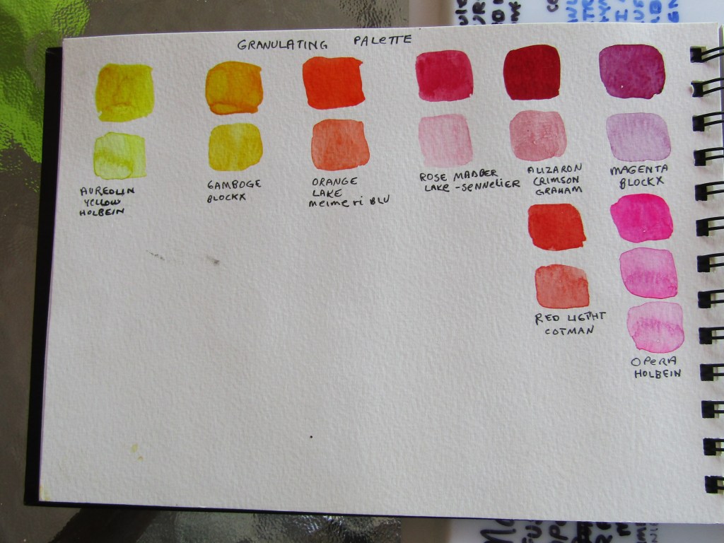 I’ve been wanting to expland and explore color for a long time. It seems like the time has come. I bought a new empty palette and no funds to fill it. If you have any idea of how pricey good watercolors can be, be aware that living in Mexico can make what is hard even harder when it comes to getting quality art materials. It’s getting easier, but believe me, it’s still a struggle. Over a year and a half ago I bought Graham’s watercolor collection and got sick without a chance to open them up. I forgot about them. Well, I decided to look through my stash and see if there were any remnants of colors I could scrape together to make the new palette I wanted. I spent two days rescuing tiny bits of paint and putting them in the new palette and also discovered the missing Graham colors. Turns out they are wonderful. Hurray Portland, OR. So here’s what I put together which I am exploring. The idea is to use only or mostly granulating colors. Use no greens, build your own (I cheated and allowed myself Grahams’ Veridian because I love it so. I built cooler and warmer tones a tube of Veridian only. So, here’s what I put together as a beginning palette.